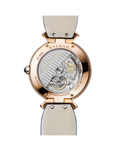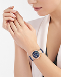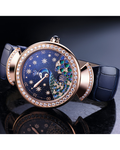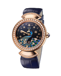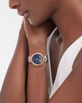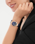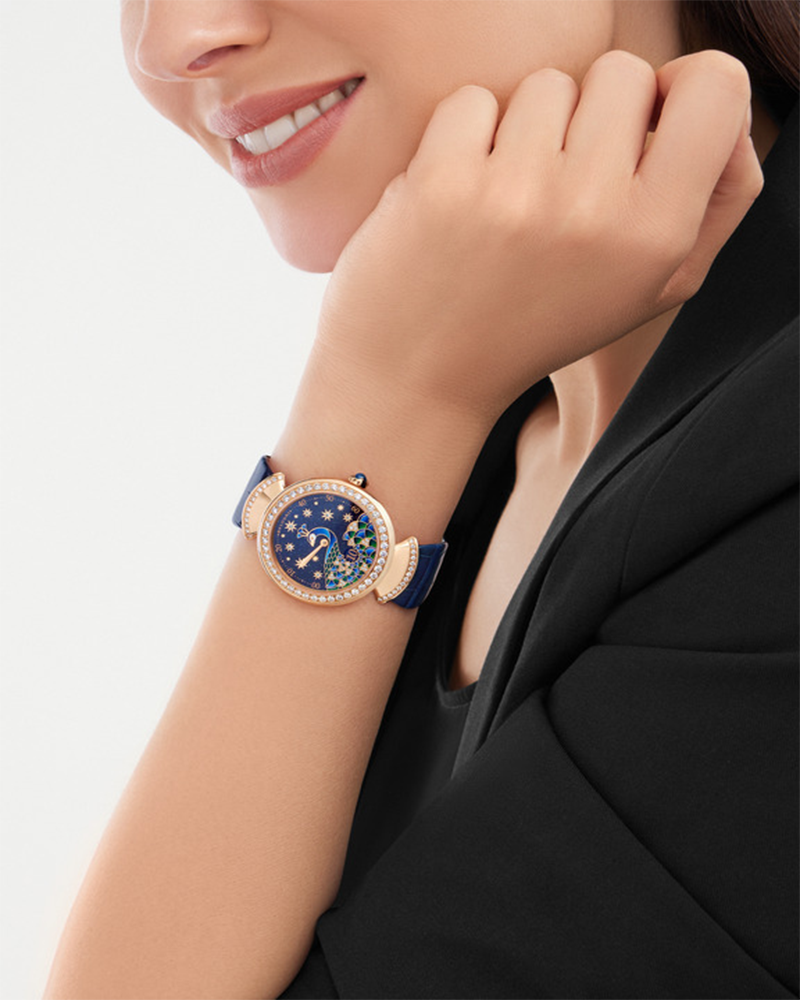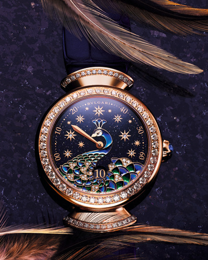 In a celebration of Bvlgari’s passion for iconic birds, the DIVAS’ DREAM timepiece boasts an exceptional miniature hand-painted peacock, embodying elegance and exceptional beauty. Sophisticated jewels glide gracefully alongside exceptional watchmaking savoir-faire, the precious watch infuses Italian passion and romance with Swiss Haute Horlogerie, marking time with its retrograde display. The fan-shaped decor encompassing the case celebrates the collection’s iconic motif inspired by the mosaics of the ancient Baths of Caracalla, paying homage to femininity with an unmistakable Roman spirit. DIVAS' DREAM watch with mechanical manufacture movement, automatic winding, jumping hours and retrograde minutes (180°), 37 mm 18 kt rose gold case, 18 kt rose gold bezel and fan-shaped links both set with brilliant-cut diamonds, 18 kt rose gold crown set with a sapphire, aventurine dial with miniature painted peacock, stars and indexes in brilliant-cut diamonds, blue leather strap and 18 kt rose gold ardillon buckle.
