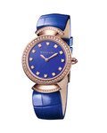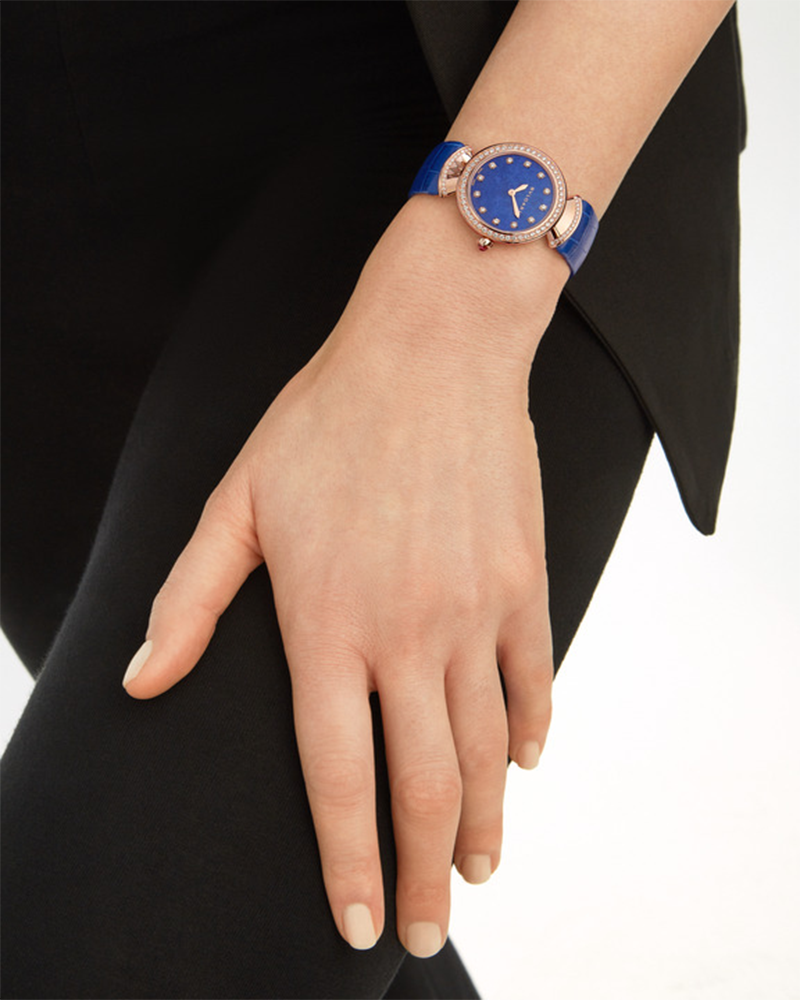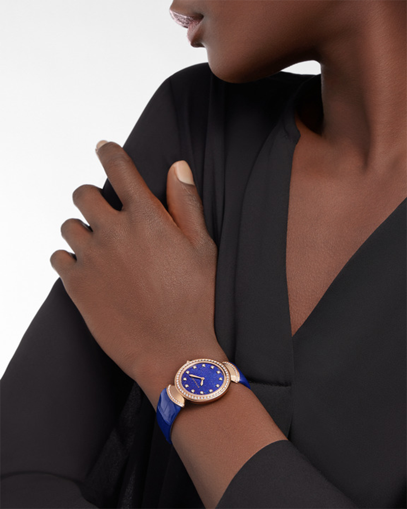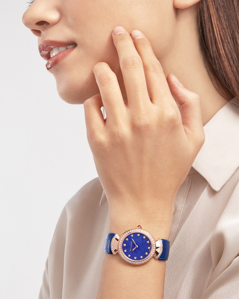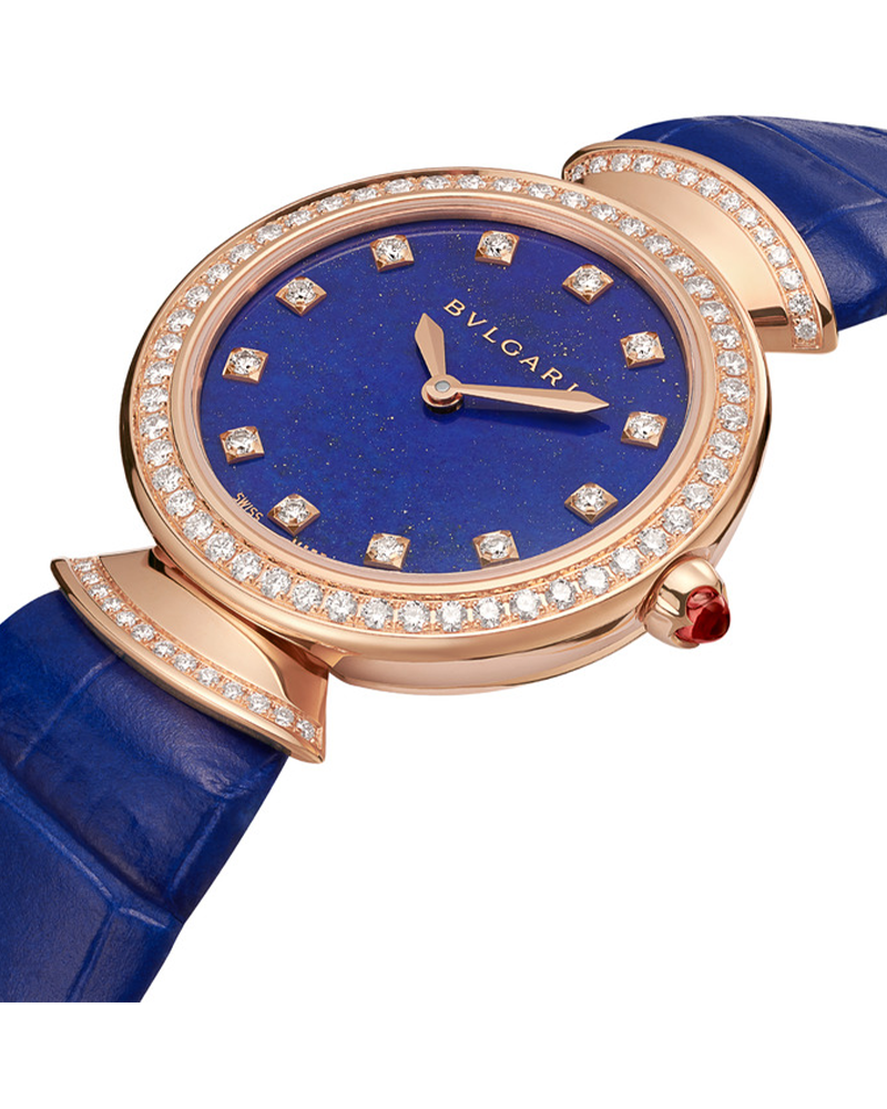 Framing the intensity of a natural gemstone dial with the delicacy of the collection’s iconic fan-shaped motif, the DIVAS’ DREAM timepiece blends Bvlgari’s passion for colour with the refinement of a graceful design. Capturing the vivid shades and the sensual curves of Rome’s ancient mosaics at the Caracalla Baths, the DIVAS’ DREAM watch pays homage to the most glamorous divas and charismatic women, with unmistakable Roman spirit. DIVAS' DREAM watch with quartz movement, 30 mm 18 kt rose gold case, 18 kt rose gold bezel and fan-shaped links both set with round brilliant-cut diamonds, 18 kt rose gold crown set with a cabochon-cut pink tourmaline, lapis lazuli dial, diamond indexes, blue leather strap and 18 kt rose gold pin buckle.Water-resistant up to 30 metres.