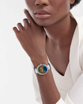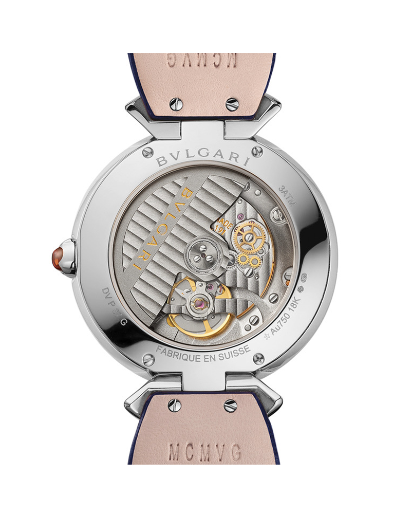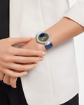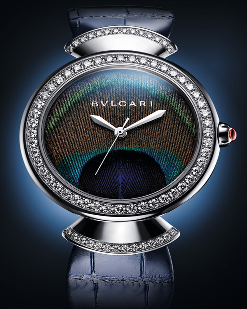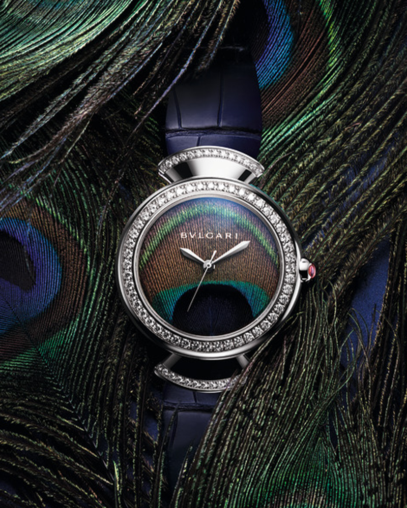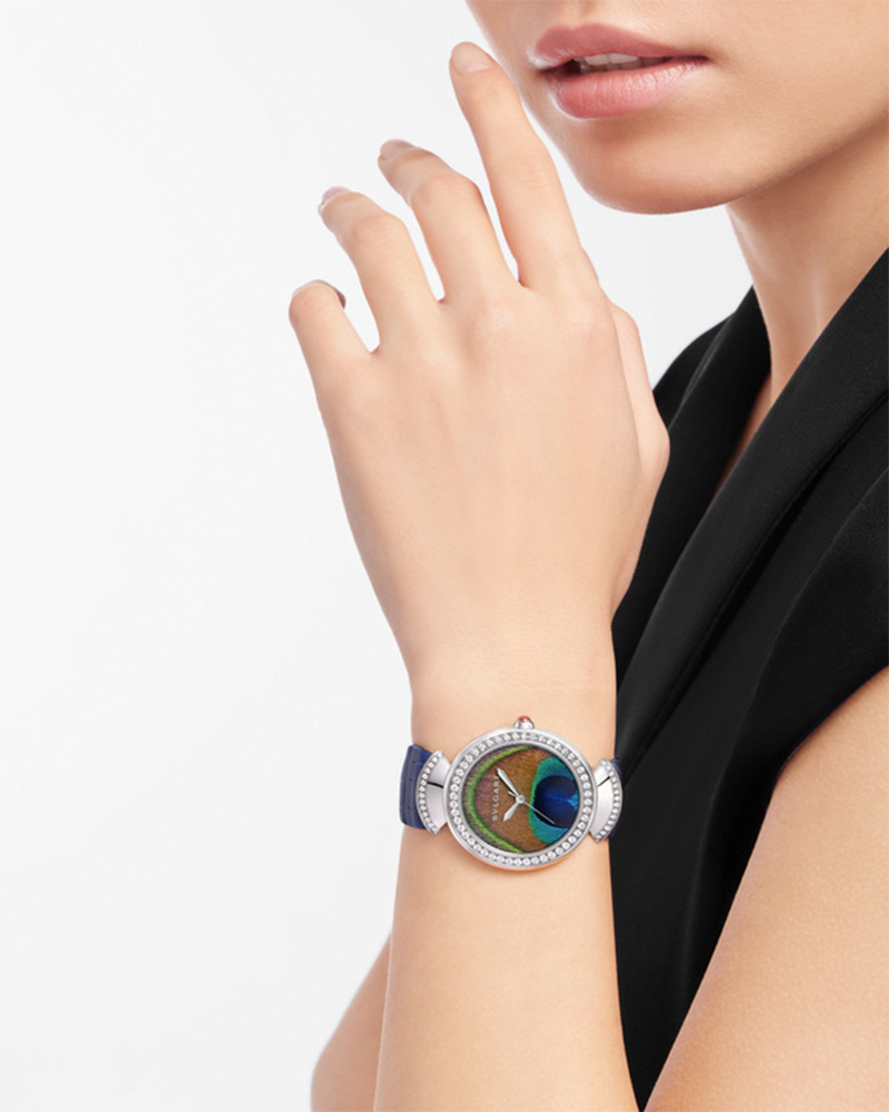 Making its mark with a self-assured style, the DIVAS’ DREAM watch is set with a vibrant peacock’s feather on its dial - a great example of Bvlgari’s passion for unexpected materials and vivid colours, executed with the confidence of a master designer. The iconic fan-shaped motif of the collection, inspired by the mosaics of the Roman Baths of Caracalla, embraces the natural beauty of the iridescent feather, while a mechanical self-winding movement powers the watch, honouring women’s appreciation of both aesthetics and uncompromising quality.