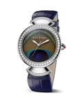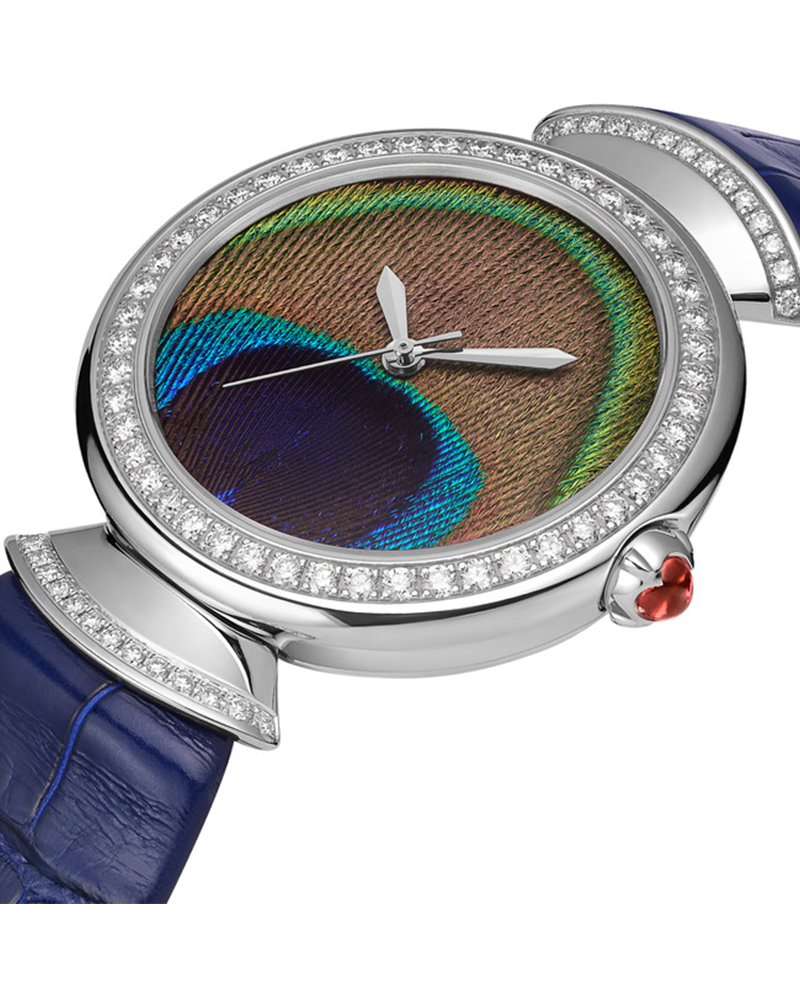 DIVAS' DREAM watch with mechanical manufacture movement, automatic winding, BVL 191 calibre, 37 mm 18 kt white gold case, 18 kt white gold bezel and fan-shaped links both set with brilliant-cut diamonds, 18 kt white gold crown set with a cabochon-cut pink tourmaline, natural peacock feather dial, blue leather strap and 18 kt white gold pin buckle. Water-resistant up to 30 metres.