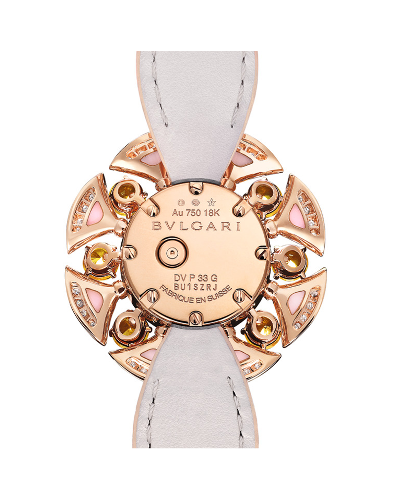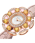 DIVAS' DREAM watch with quartz movement, 33 mm 18 kt rose gold case and petals set with round brilliant-cut diamonds (about 1.40 ct), pink opal inserts and citrine (about 2.50 ct), mother-of-pearl dial, pink leather bracelet and 18 kt rose gold folding buckle set with diamonds.