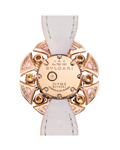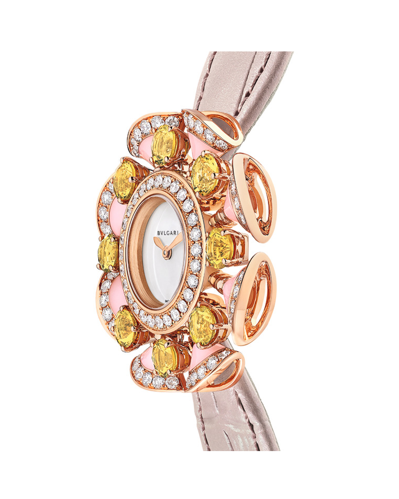 Feminine and flirtatious, the DIVAS' DREAM cocktail watch is an invitation to embrace life with passion. Inspired by the exuberance of the Dolce Vita, this sophisticated creation in 18 kt rose gold exudes the inimitable spirit of this golden era through the joyful colours of pink opal inserts and citrine stones matched with a refined mother-of-pearl dial and pink leather bracelet. A perfect harmony of sensuous shapes, alluring gems and high jewellery techniques, this piece boasts an incredibly flexible setting bringing a sense of movement to the collection’s iconic fan-shaped motif.