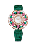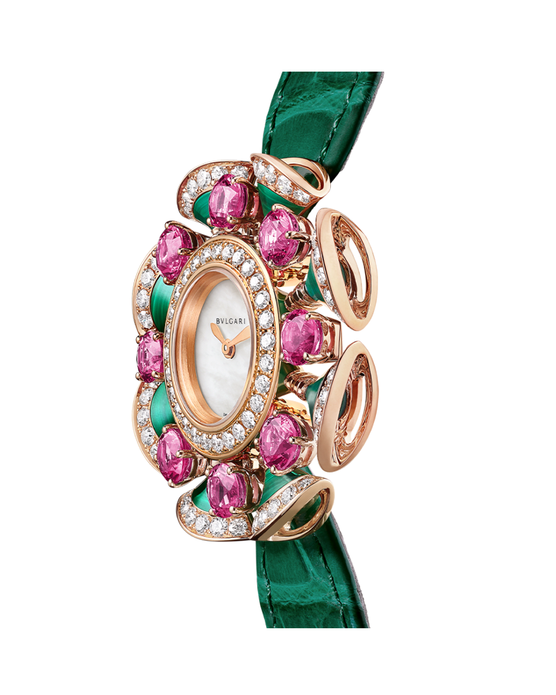 DIVAS' DREAM High Jewellery watch with quartz movement, 33 mm 18 kt rose gold case and petals set with round brilliant-cut diamonds (about 1.42 ct), malachite inserts (about 3.20 ct) and pink tourmalines (about 2.82 ct), mother-of-pearl dial, green leather bracelet and 18 kt rose gold folding buckle set with diamonds.