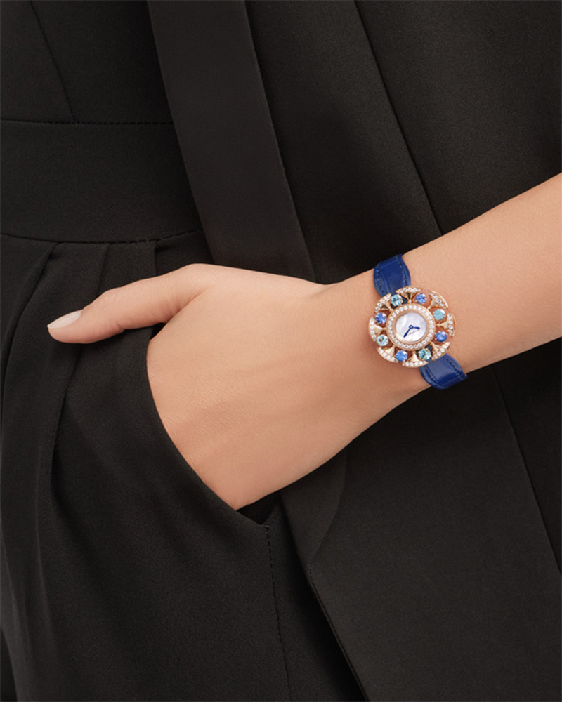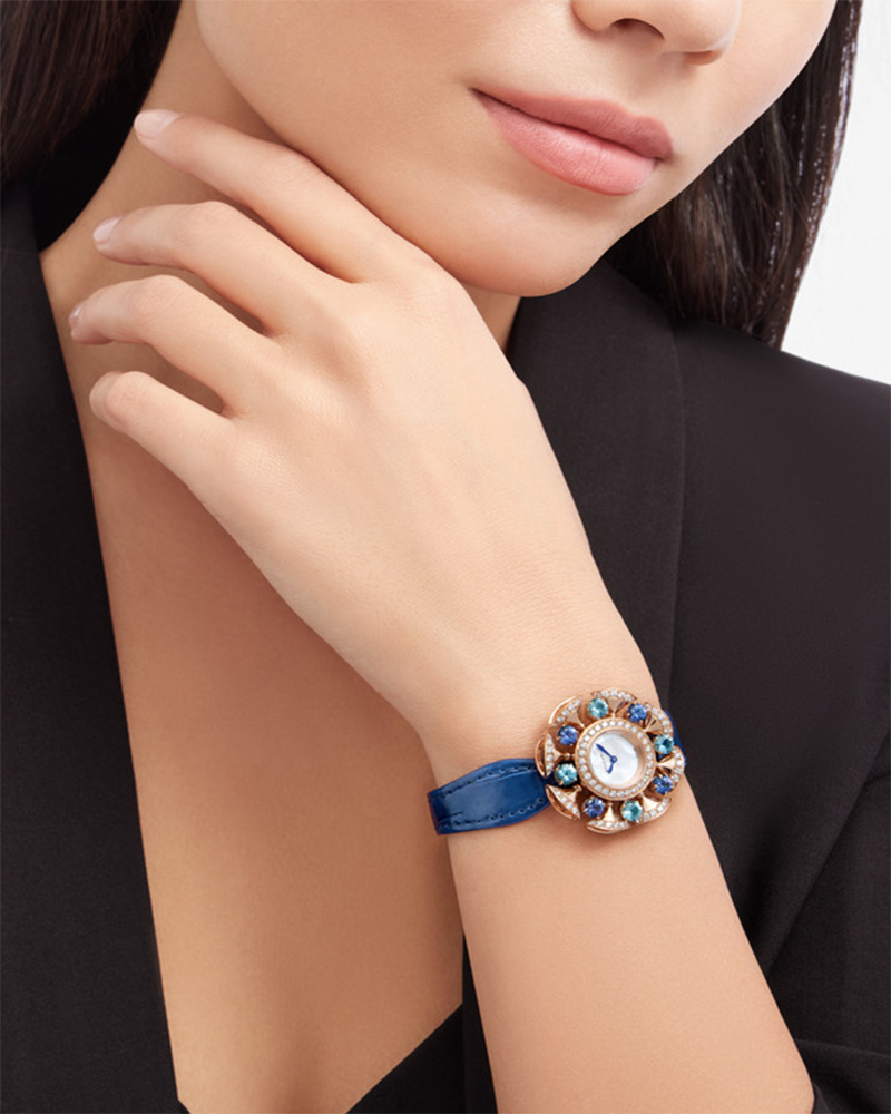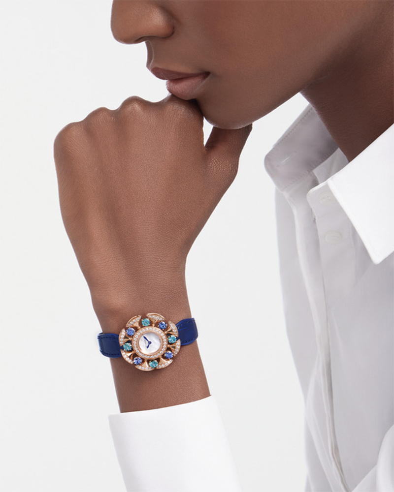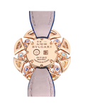 Vibrant with colour and emotion, the DIVAS' DREAM watch is an invitation to embrace life with passion. Inspired by the exuberance of the Dolce Vita, this sophisticated creation in 18 kt rose gold exudes the inimitable spirit of Rome's golden era through the joyful shades of topazes and tanzanites, encircling the refined mother-of-pearl dial lit by diamonds. Completed by a matching blue leather bracelet, the timepiece interprets the collection's iconic fan-shaped motif with aesthetic dynamism, high jewellery crafting techniques and vivacious gemstones.