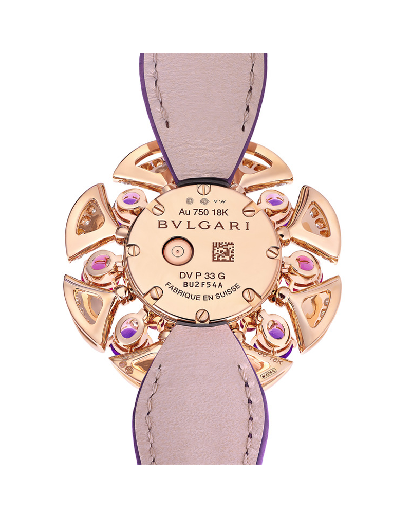 DIVAS' DREAM watch with quartz movement, 33 mm 18 kt rose gold case, 18 kt rose gold petals set with round brilliant-cut diamonds and alternating with four amethysts and four tourmalines, mother-of-pearl dial, purple leather bracelet and 18 kt rose gold folding buckle set with diamonds. Water resistant up to 30 metres.