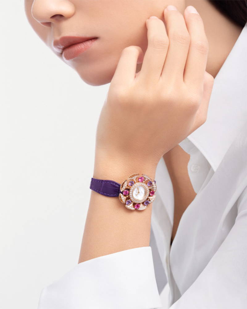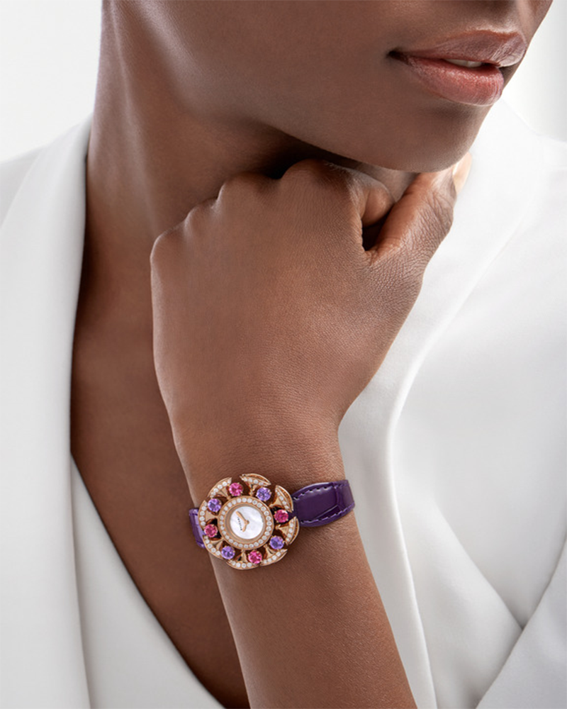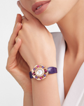 Vibrant with colour and emotion, the DIVAS' DREAM watch is an invitation to embrace life with passion. Inspired by the exuberance of the Dolce Vita, this sophisticated creation in 18 kt rose gold exudes the inimitable spirit of Rome's golden era through the joyful shades of amethysts and tourmalines, encircling the refined mother-of-pearl dial lit by diamonds. Completed by a matching purple leather bracelet, the timepiece interprets the collection's iconic fan-shaped motif with aesthetic dynamism, high jewellery crafting techniques and vivacious gemstones.