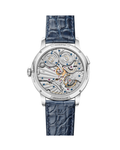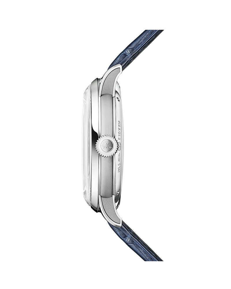 In its vintage steel case and gradient blue dial matching the small-scale lined leather strap, the Duometre Quantieme Lunaire showcases the Duometre concept in style. The sectorized dial is finished in a variety of styles: opaline (top of dial), satin-finish (center of counters), circular blue (around counters), and sunray (power reserves). On the reverse side of this complication watch, the twin-barrel Calibre 381 – one dedicated to indicating the time, the other to complications – reveals the mechanics of its finely decorated components: sunrayed côtes de Genève, chamfered bridges, blue screws.CASE Stainless steel Diameter: 42.5 mm Thickness: 13.05mm WATER RESISTANCE 5 bar DIAL Appliqued numerals, Blue, Opaline STRAP Blue leather Interchangeable: No Lug width: 21mm Length 12h: 75mm Length 6h: 120mm BUCKLE Double Folding Buckle Stainless steel Buckle width: 18mm JAEGER-LECOULTRE CALIBRE 381 FUNCTIONS Date, Jumping seconds, Seconds, Moon phase, Hour - Minute, Twin Power-Reserve MOVEMENT Manual winding, Components: 414, Vibrations per hour: 21600, Jewels: 42, Barrel: 2, Thickness: 8.24mm, Power reserve: 50 hours