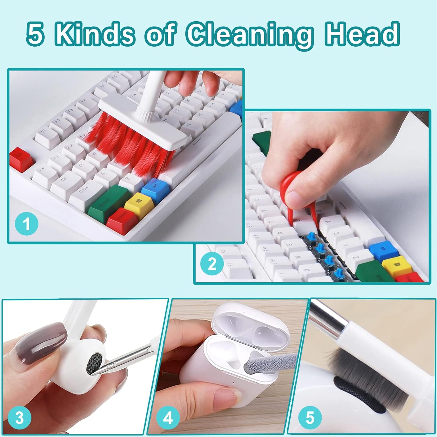 - 5 Cleaning Tools in 1 – Nylon bristles, flocking sponge, high-density brush, metal pen tip, and keycap puller for every tech surface