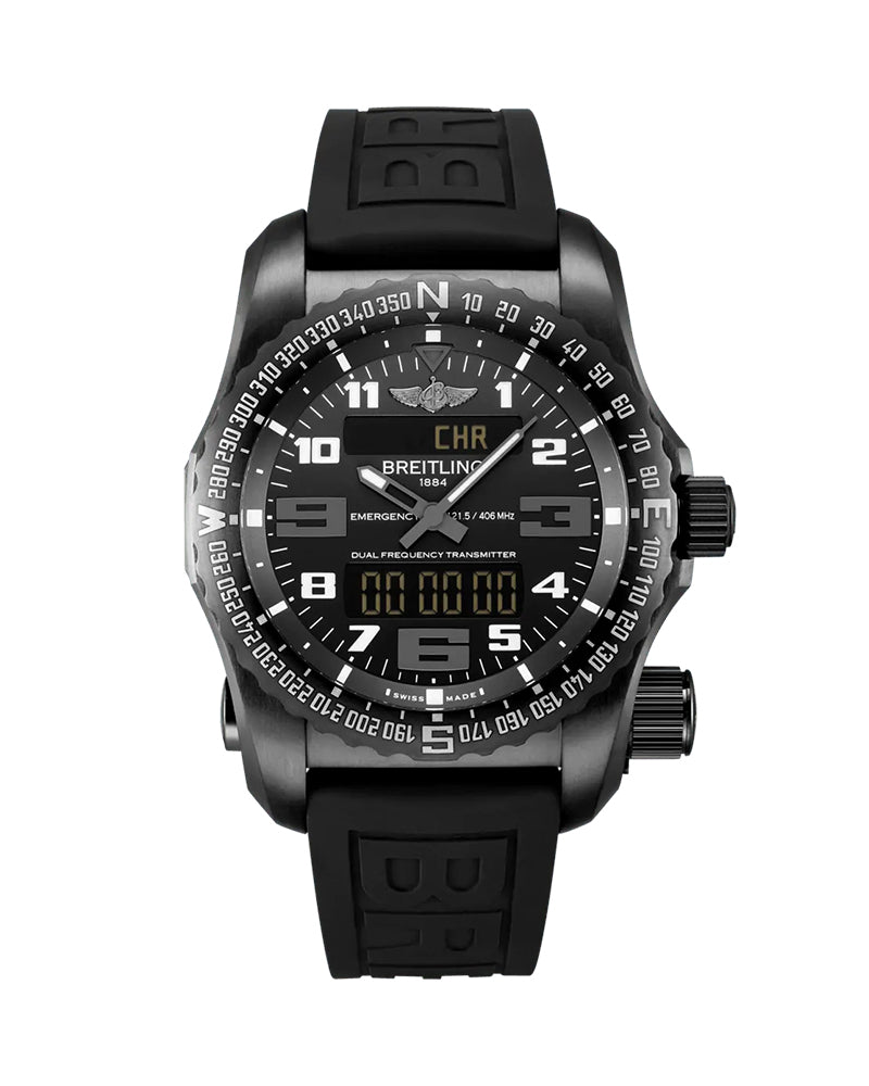 Professional watch, 51 mm,Movement :SuperQuartz, thermocompensated quartz electronic, analog and 12/24 hr LCD digital display; EOL indicator. Chronograph :1/100th second, max. 99 days,23 hrs 59 min. 59.99 sec.Calendar :Digital, day and date programmed for 4 years.Functions : countdown timer,2nd timezone,alarm.Dual frequency distress beacon:121.5 MHz and 406 MHz.Calibre Breitling B76.Titanium Case. Bidirectional Compass Scale Bezel. ratcheted. Screw-locked, two gaskets.Sapphire crystal, glareproofed on both sides. Valcona Black Dial -Black Rubber Strap with folding Buckle.