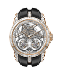 The skeleton calibres manufactured by Roger Dubuis in Geneva are the essence of the expressive singularity of the Excalibur collection. Complying with one of the most respected certifications of Haute Horlogerie, the Poinçon de Genève, the Excalibur watches are designed like contemporary works of art. Every single component being finished by hand, the watches are symbols of passion. The work of hyper-skilled craftsmen is at the forefront of each watch with a direct view on the creative mechanics making these pieces more alive than ever. Pink gold case paved with baguette-cut diamonds on the bezel, lugs and sides Sapphire crystal with antireflective coating
