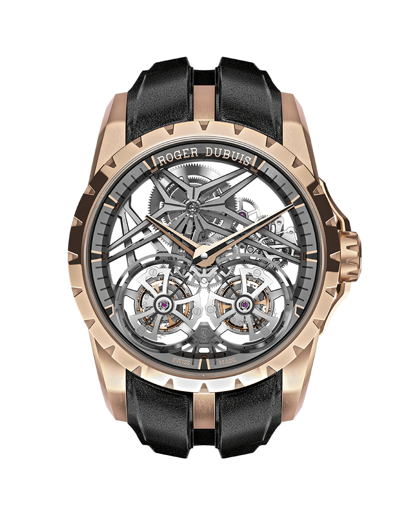MOVEMENT Energy: Manual-winding Indications: Hour - Minute Power reserve: 72 Hours. DECOR Shot-blasted, trued-up or circular-grained main plate and bridge with NAC coating. CASE Pink gold case with sapphire crystal with antireflective coating Pink gold open case back with sapphire crystal Size: 45mm, Water Resistance: 10 bar (100 m). DIAL Grey double surface flange with engraved minute track and transfered texts, polished and pink gold plated hour markers with SLN in the center. Main material: Pink Gold 18K. STRAP- According our non-exotic policy, Excalibur collection is adorned with a premium leather strap, built in volume to follow the design of the case and the movement. The strap is interchangeable thanks to Quick Release System. Color: Black. CLASP Pink gold cover 750/1000 with titanium blades, triple folding, interchangeable with Quick Release System - QRS Type: Pink Gold 18K