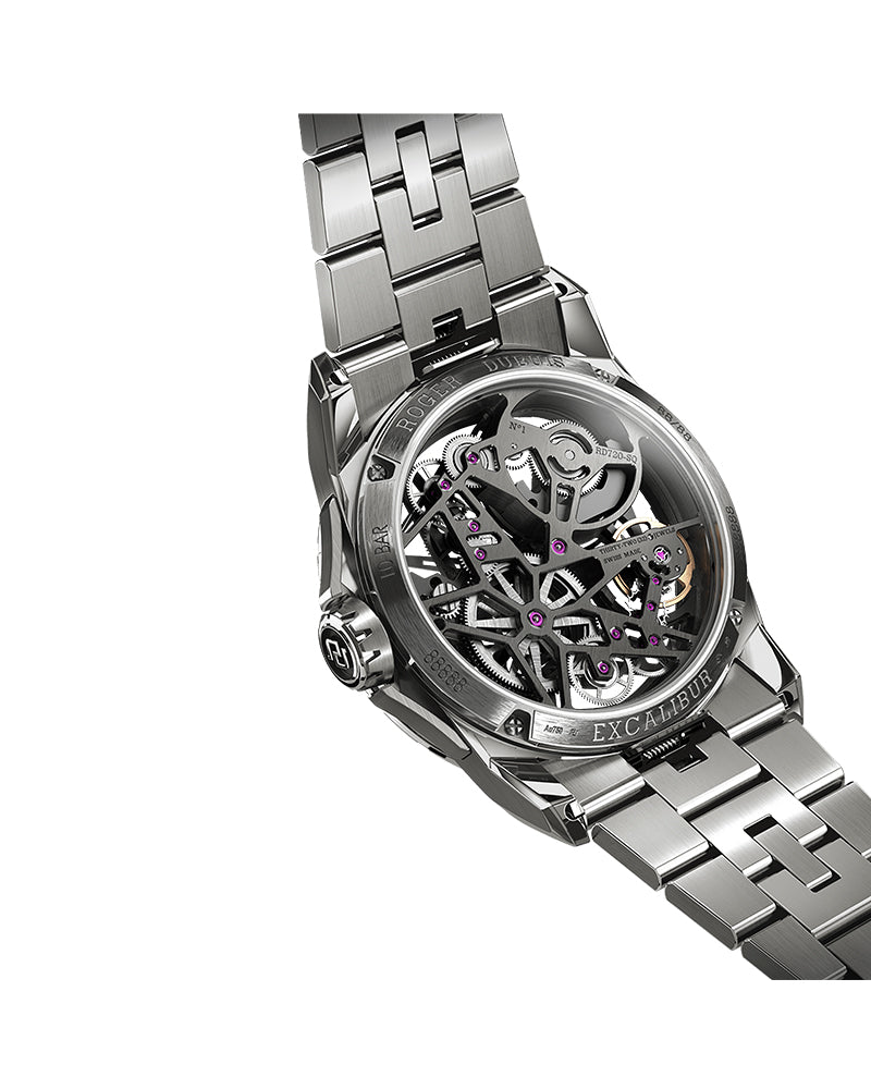 Excalibur Monobalanciar Titanium - Automatic, Titanium. CASE -Titanium case with sapphire crystal and anti-reflective coating Titanium bezel Titanium crown Titanium open case back with sapphire crystal and anti-reflective coating, Water Resistance: 10 bar (100 m).DIAL - Grey double surface flange with transferred texts and minute track, polished and grey hour markers with SLN in the center. STRAP - Titanium bracelet with satin brushed links and polished angles, interchangeable with Quick Release System - QRS Titanium triple folding buckle.