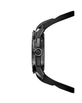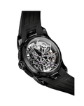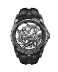 The skeleton calibres manufactured by Roger Dubuis in Geneva are the essence of the expressive singularity of the Excalibur collection. Complying with one of the most respected certifications of Haute Horlogerie, the Poinçon de Genève, the Excalibur watches are designed like contemporary works of art. Every single component being finished by hand, the watches are symbols of passion. The work of hyper-skilled craftsmen is at the forefront of each watch with a direct view on the creative mechanics making these pieces more alive than ever. CASE-Ceramic case Ceramic bezel Ceramic crown Sapphire crystal with anti-reflective coating Titanium DLC open case back with sapphire crystal Size: 42mm, Water Resistance: 10 bar (100 m),DIAL Black double surface flange with engraved minute track and transferred texts, polished and Grey hour markers with SLN in the center Main material: Ceramic STRAP According our non-exotic policy, Excalibur collection is adorned with a premium calf leather strap, built in volume to follow the design of the case and the movement. The strap is interchangeable thanks to Quick Release System. Black Leather CLASP Black DLC triple folding buckle interchangeable with Quick Release System - QRS Type: Titanium, MOVEMENT-Energy: Automatic, self-winding Indications: Hour - Minute Power reserve: 72 Hours