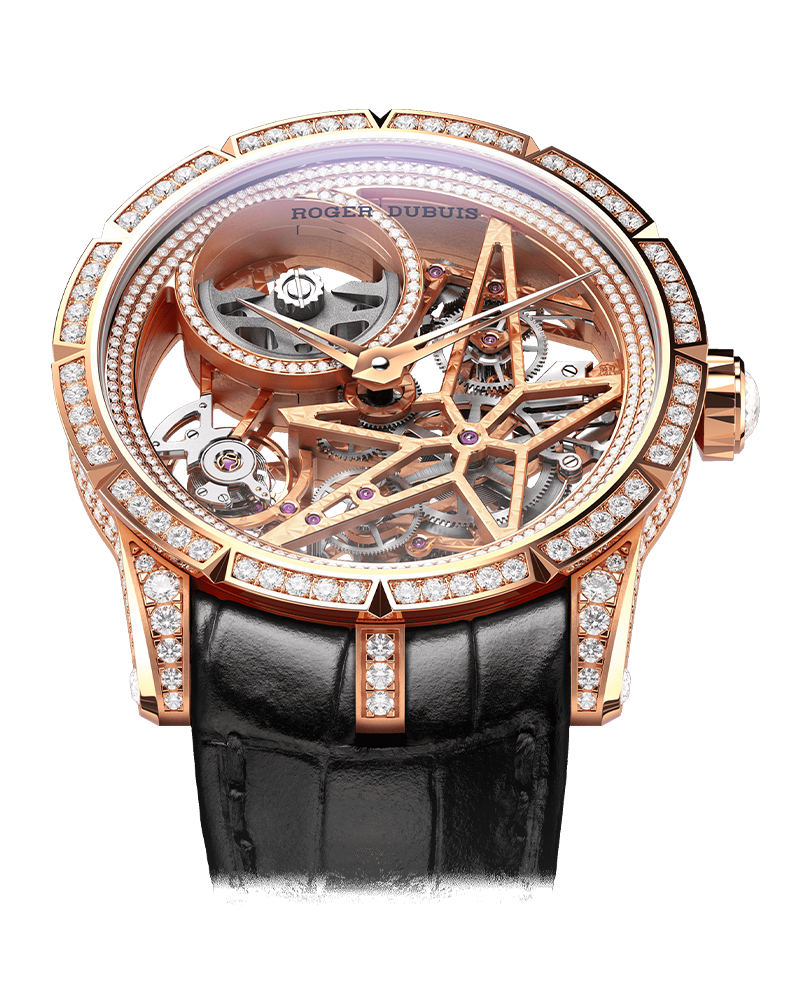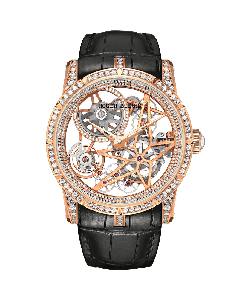 The skeleton calibres manufactured by Roger Dubuis in Geneva are the essence of the expressive singularity of the Excalibur collection. Complying with one of the most respected certifications of Haute Horlogerie, the Poinçon de Genève, the Excalibur watches are designed like contemporary works of art. Every single component being finished by hand, the watches are symbols of passion. The work of hyper-skilled craftsmen is at the forefront of each watch with a direct view on the creative mechanics making these pieces more alive than ever. CASE - Pink gold case paved with with round diamonds on the bezel, lugs and sides Sapphire crystal with anti-reflective coating Pink gold open case back with sapphire crystal, Size: 42mm Water Resistance: 3 bar (30 m),DIAL-Flange set with two rows of round diamonds. Micro-rotor bridge set with round diamonds Main material: Pink Gold 18K,STRAP - Black strap, CLASP- Pink gold adjustable folding buckle set with brilliant-cut diamonds, Type: Pink Gold 18K,MOVEMENT- Energy: Automatic, self-winding, Indications: Hour - Minute, Power reserve: 60 Hours
