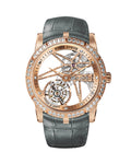 MOVEMENT- Manual-winding, Indications: Hour - Minute, Power reserve: 60 Hours. DIAL- Pink gold plated flange with transfered texts and engraved minute track, diamond-set hour markers, Main material: Pink Gold 18K, STRAP-Grey Leather strap, interchangeable with Quick Release System, Color: Brillant Slate Grey, CLASP-Pink gold cover with pink gold blades, triple folding, interchangeable with Quick Release System - QRS, Type: Pink Gold 18K