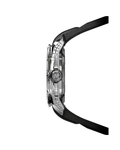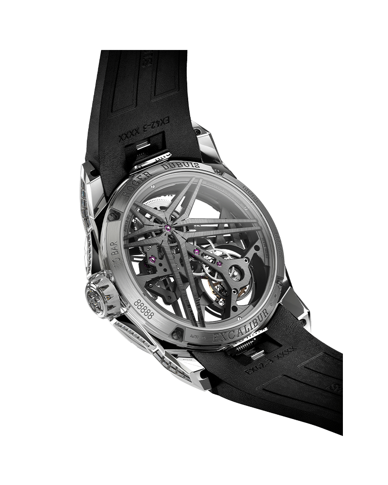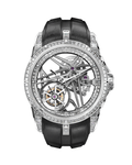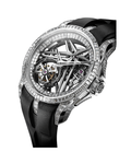 MOVEMENT Energy: Manual-winding Indications: Hour - Minute Power reserve: 72 Hours. DECOR Shot-blasted and trued-up main plate and bridges with NAC or Blue CVD coating.CASE- White gold case set with baguette diamonds Sapphire crystal with anti-reflective coating and Roger Dubuis logo metallized on the inside White gold open case back wit crystal sapphire. Size: 42mm, Water Resistance: 10 bar (100 m).DIAL- White gold flange set with baguette diamonds. Main material: White Gold 210 18K. Strap - Black Leather. CLASP