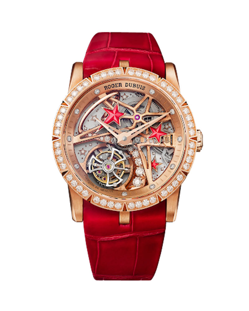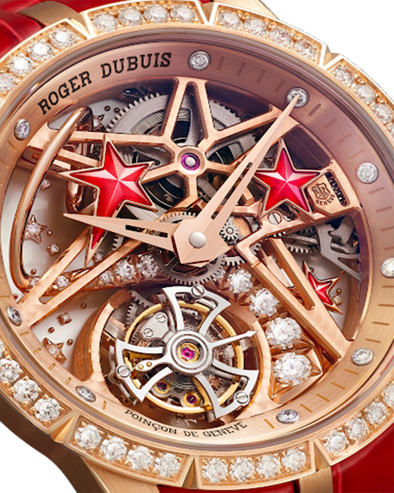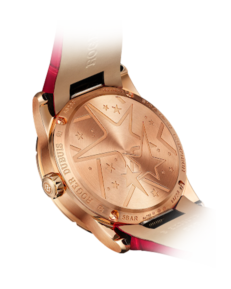 The next generation of skeleton flying tourbillon to be displayed in such a small size piece, the Excalibur 36 is the perfect illustration of Roger Dubuis’ ability to build the impossible. Smaller size watches must also feature daring and technical calibres. The highly skilled craftsmen at Roger Dubuis managed to develop a small size tourbillon, one of the very few available on the market. The mechanism is then suspended in the a night sky decor, displaying a shooting star which tail flies above and below the bridges of the movement. The star itself is in carved enamel, bringing light and depth to the decor. Diamonds are set on the watch to add brillance and shine to the whole Excalibur Shooting Star.