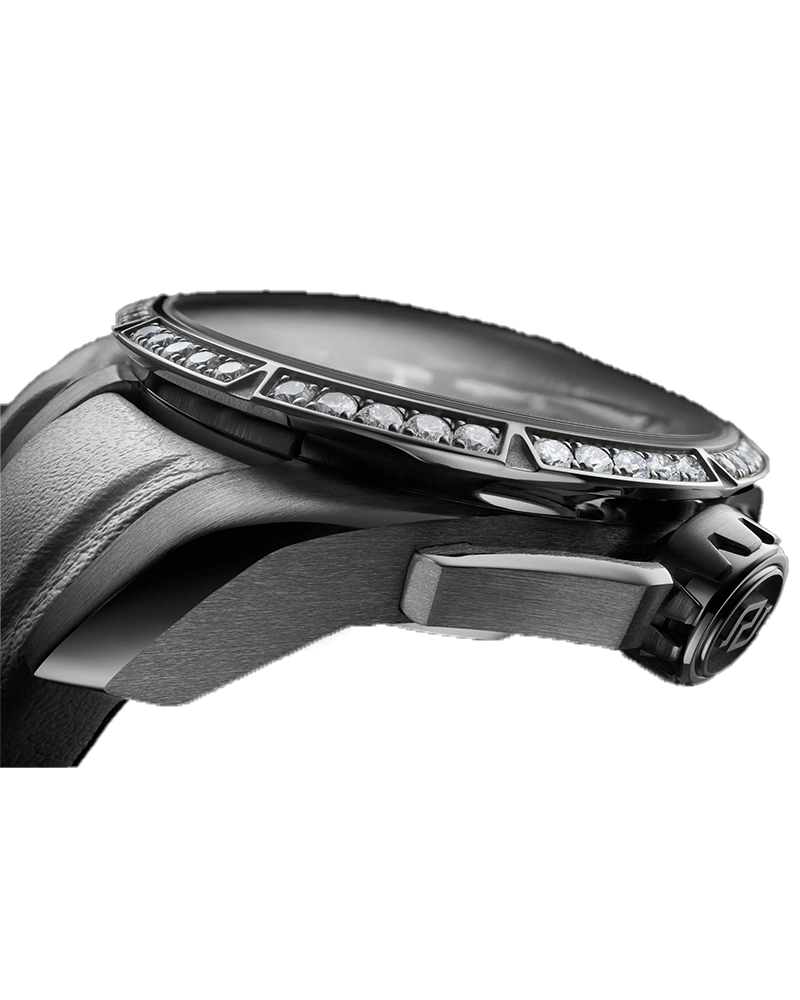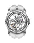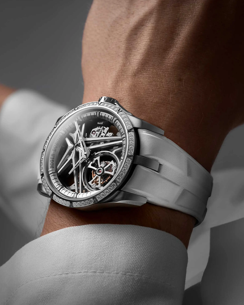 Excalibur Monotourbillon White Gold Minimalistic yet complex. Clean yet daring. For the first time ever, our iconic Monotourbillon calibre is housed in a white gold case whose radiant beauty is further enhanced by diamonds. The masterpiece strikes a fine balance between high horology and pure aesthetics. Case - White Gold* case White Gold* bezel with round-cut diamonds White Gold* crown Sapphire crystal with anti-reflective coating White Gold* open case back with sapphire crystal *White Gold 750/1000 Dial - Rhodium plated double surface flange with engraved minute track and transferred texts, polished rhodium hour markers with White SLN in the center. Strap - Excalibur collection is adorned with a premium leather strap, built in volume to follow the design of the case and the movement. The strap is interchangeable thanks to Quick Release System. Clasp - White gold cover (750/1000) with Titanium blades, triple folding interchangeable with Quick Release System - QRS