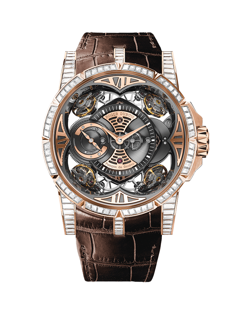 Power reserve: 40 HoursCASE Pink gold case with bezel and lugs set with baguette-cut diamonds Sapphire crystal with anti-reflective coating Pink gold open case back with sapphire crystal.Size: 48mm. Water Resistance: 3 bar (30 m) DIAL Main material: Pink Gold 18K. Strap Color: Semi Mat Bark Brown.CLASP- Pink gold, double folding, Type: Pink Gold 18K.DECOR Circular-grained main plate and bridges with NAC coating