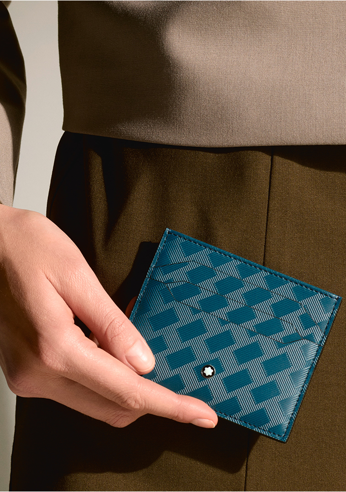 The Extreme 3.0 card holder offers 6 slots for credit cards along with an extra open pocket. The embossed avio blue grey full-grain bovine leather features the distinct Extreme 3.0 motif.