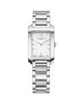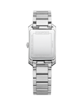 A delicate, small watch with a rectangular case and a polished satin-finished stainless steel bracelet, this ladies' luxury wristwatch promises a timeless aesthetic. It comes with a scratch-resistant curved sapphire crystal and a full case back. With rhodium-plated Arabic numerals, sword-shaped hands and a Swiss quartz movement, this rectangular watch for women balances graceful design and enduring quality. The watch bracelet is easily interchangeable, giving the wearer the freedom to transform her look when she wants.