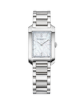 Thoughtfully designed, this ladies’ satin-finished stainless steel watch with a shimmering mother-of-pearl dial features a chic grey minute track and 4 Top Wesselton brilliant-cut diamonds, with 2 each at 6 and 12 o’clock. The HAMPTON mother-of-pearl rectangular watch for women comes with rhodium-plated sword-shaped hands, riveted indexes, and a diamond-set dial. The bracelet encompasses 3 rows of polished and satin-finished stainless steel, offering an elegant finish for this sophisticated quartz-powered timepiece.