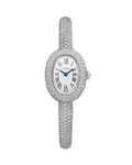 Baignoire watch, mini model, size 15, quartz movement. Rhodium-finish 18K white gold (750/1000) case set with 171 brilliant-cut diamonds totaling 1.91 carats. Rhodium-finish 18K white gold (750/1000) beaded crown set with a brilliant-cut diamond totaling 0.08 carats. Rhodium-finish 18K white gold (750/1000) rigid bracelet set with 380 brilliant-cut diamonds totaling 3.11 carats. Silvered dial, blued-steel sword-shaped hands, sapphire crystal. Length: 24.6 mm, width: 18.7 mm, thickness: 7.2 mm. Water-resistant up to 3 bar (approx. 30 meters/100 feet).