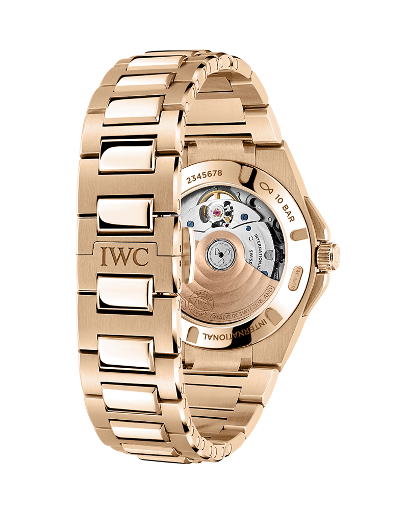 The Ingenieur Automatic 35 complements IWC Schaffhausen’s Ingenieur collection with a version with a case size of 35 millimetres. The modern Ingenieur revisits the bold aesthetic codes of the Ingenieur SL, Reference 1832, a luxury sports watch created by renowned Geneva watch designer Gérald Genta in the 1970s. This model features a case and integrated bracelet made of 18-carat 5N gold, a gold-colored dial, and gold appliques and hands. Designers and engineers worked hand-in-hand to define, proportion and finish every part and characteristic of the Ingenieur faithfully to a 35-millimeter case size. To achieve the visual proportions and desired ergonomics, every element had to be re-defined. The result offers the instantly recognizable look and feel of the Ingenieur in a smaller and flatter execution with perfect ergonomics and comfort. Just as the 40-millimeter version, the Ingenieur Automatic 35 impresses with its highly detailed finishing. The watch is finished with a combination of satin-finished and polished surfaces, adding texture and reflecting the light beautifully. Secured to the case ring with five functional screws, the bezel is satin-finished with a polished outer edge. The H-links of the bracelet are also satin-finished with polished edges, while the centre links and case back are fully polished. A hallmark feature of the Ingenieur Automatic 35 is its intricately crafted dial with the characteristic «Grid» pattern, consisting of small lines and squares. The appliques are individually mounted by hand and filled with Super-LumiNova®. The open case back showcases the 47110 calibre with a power reserve of 42 hours. The movement is finished with circular graining and Geneva stripes and features a gold-plated oscillating weight.