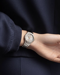 In 2023, Baume & Mercier unveiled the new leading model of the collection: the Riviera M0A10730, a true halo of light. The warmth of its sun-satin gilded dial, its transparent transfer waves, and its sunny radiance bring sculptural shape to the Roman numerals, the riveted indexes coated in Superluminova (C1, blue glow), and the faceted gilded hands that indicate the hours, minutes and seconds. The date appears in a discreet aperture at 3 o’clock. The elegance of this timepiece, which is fascinating both by day and by night, is exalted by four brilliant-cut diamonds (Top Wesselton, VS quality, 0.05 ct) which are set into the polished stainless-steel bezel and sun-satin dodecagonal case.