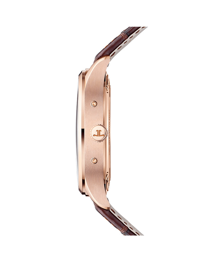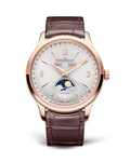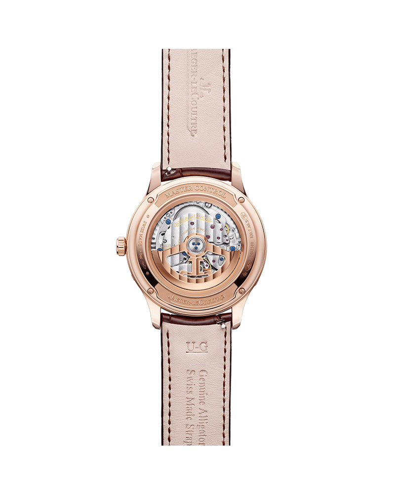 "In its 40-mm case in ÒLe Grand RoseÓ gold, the new Master Control Calendar offers its complications their most beautiful role. It gives the time but also the complete calendar, not to mention its ingenious jumping date, finished with a refined red Jaeger-LeCoultre anchor. As its name suggests, this complication allows the date indicator to literally jump between the 15th and the 16th day of the month, ceding place for the moon phase. In an aperture at 6 oÕclock, the star of the night is revealed or hidden against a background of the starry midnight blue sky.
