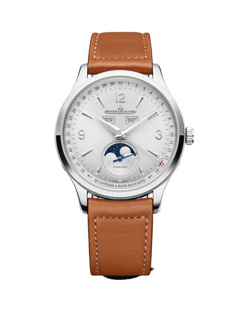 CASE - Stainless steel, Diameter: 40 mm Thickness: 10.95mm, WATER RESISTANCE - 5 bar, DIAL-Polished rhodium-finish numerals and hour-markers, Silvered grey, sunray-brushed.HANDS - Dauphines .STRAP - Two straps included with the watch:Stainless steel Calfskin Leather,Light-brown, BUCKLE - Double Folding Buckle Stainless steel Buckle width: 18mm, JAEGER-LECOULTRE CALIBER 866. FUNCTIONS - Month, Hour - Minute, Moon phase, Seconds, Day, Date. MOVEMENT-Automatic winding, Components: 344, Vibrations per hour: 28800, Jewels: 34, Barrel: 1, Thickness: 6.15mm, Power reserve: 70 hours