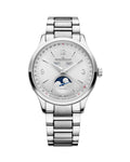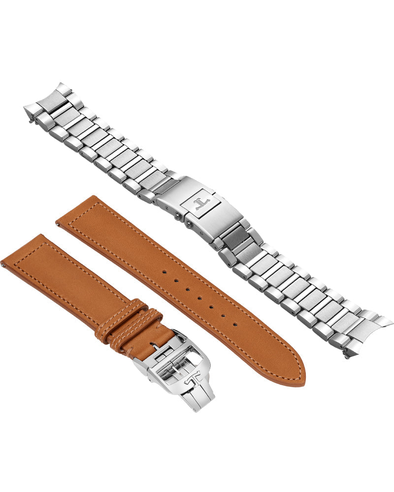 Featuring a 40-mm case, curved lugs, Dauphine hands and appliqué hour-markers, the new Master Control Calendar embodies the watchmaking spirit of this signature collection, achieving a subtle balance between technical prowess and contemporary aesthetics. On this model which boasts a complete calendar, the date indications (day and month) appear in blue in two apertures situated in the center of the dial, while the moon phase comes to life at 6 o'clock. Thanks to a new interchangeability system, the Master Control Calendar is available with two straps: One in stainless steel and the other in Novonappa® calfskin with a folding clasp. This duo of straps changes the look of the watch, effortlessly adapting from a casual look to a more sophisticated elegance.