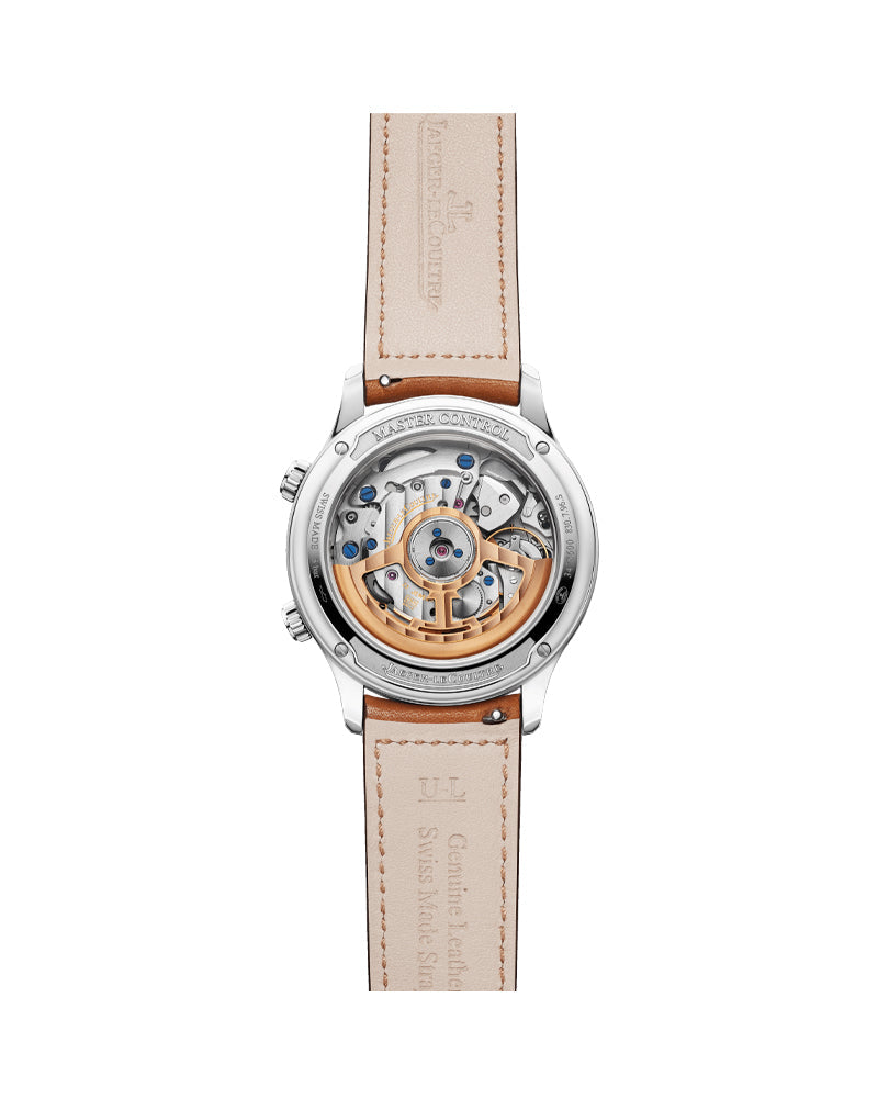 Through The Sound Maker™, Jaeger-LeCoultre wishes to highlight the greatest chiming mechanisms developed at the Manufacture since its creation in 1833. Inspired by the first Memovoxes of the 1950s and 1960s, this original version features an alarm with an iconic school bell sound combined with a date indicator, which scrolls through an aperture at 3 o'clock. Between respect for traditions and the cult of innovation, the Master Control Memovox cultivates the art of sobriety with a revisited caliber, double polished, satin-finish case-back and new Novonappa® calfskin strap, not to mention the open case-back of the watch, which allows the eye to admire the rhythmic dance of the new hammer on the peripheral bell.