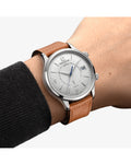 CASE - Stainless steel, Diameter: 40 mm, Thickness: 12.39mm, WATER RESISTANCE- 5 bar, DIAL- Polished rhodium-finish numerals and hour-markers, Silvered grey, sunray-brushed.HANDS-Dauphines. STRAP- Leather, Light-brown, Interchangeable: Yes, Lug width: 20mm,Length 12h: 75mm,Length 6h: 120mm, BUCKLE- Double Folding Buckle, Stainless steel, Buckle width: 18mm, JAEGER-LECOULTRE CALIBER 956. FUNCTIONS - Seconds, Hour - Minute, Date, MOVEMENT-Automatic winding, Components: 271, Vibrations per hour: 28800, Jewels: 24, Barrel: 1, Thickness: 7.47mm, Power reserve: 44 hours