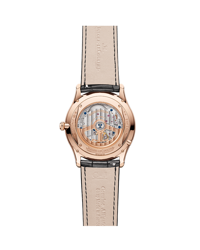 Revisiting the sharp aesthetic of the eponymous collection, the Master Ultra Thin Perpetual Calendar features an eggshell dial matching the pink gold case, which stands in elegant contrast to the black alligator strap and is extremely comfortable to wear. The golden hands with a double satin-polish finish and blue central seconds hand fly over the three sub-dials showing the date at 3 o’clock, the day of the week at 9 o’clock and the month at 6 o’clock. Featuring a moon phase at noon and a perpetual calendar, this refined complication watch is equipped with in-house Calibre 868, offering 70 hours of power reserve.