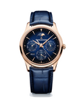 Part of the Master Ultra Thin Collection, this complication watch captivates with the finesse of its polished pink gold case and the depth of color of its dial. An intense midnight blue that brings out every detail of the Master Ultra Thin Perpetual Calendar: moon phase at noon, applied hour-markers and JL logo, polished and satin-finished golden hands, sub-dials with a double opaline finish on the outside and azure on the inside... the sapphire crystal back of this perpetual calendar reveals its movement, Calibre 868, manufactured, decorated and assembled within the Manufacture, offering 70 hours of power reserve.