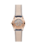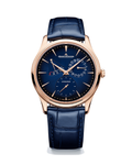The Master Ultra Thin Power Reserve in pink gold is distinguished by the purity of its lines, the architecture of its dial and the readability of its functions. The elongated hour markers and Dauphine hands with a polished and satin finish stand out against the sunray background of its midnight-blue dial, forming a magnificent contrast with the pink gold of the case. Beneath the hands, at the heart of the blue dial whose nuance increases in intensity from the centre towards the bezel, the opaline counters form a perfectly harmonious whole: power reserve on the left with zero level indication in red, date hand on the right and small seconds at 6 o‘clock. Created through a complex and meticulous manufacturing process, this intense, luminous blue is a perfect match for the navy-blue alligator leather strap. The transparent sapphire crystal case-back offers an unobstructed view of the almost 300 components of the Calibre 938, which promises 70 hours of power reserve. CASE - Pink Gold 750/1000 (18 carats), Diameter: 39 mm Thickness: 8.95mm WATER RESISTANCE 5 bar, DIAL-Appliqued hour-markers, Blue, sunray-brushed