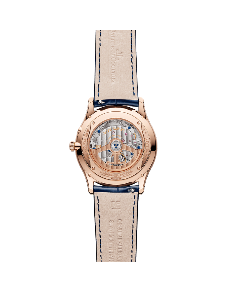 STRAP- Blue leather, Interchangeable: Yes Lug width: 21mm Length 12h: 75mm, Length 6h: 120mm BUCKLE Pin buckle Pink Gold 750/1000 (18 carats) Buckle width: 18mm JAEGER-LECOULTRE CALIBRE 938 FUNCTIONS Seconds, Date, Power-reserve, Hour - Minute MOVEMENT Automatic winding, Components: 262, Vibrations per hour: 28800, Jewels: 39, Barrel: 1, Thickness: 4.97mm, Power reserve: 70 hours