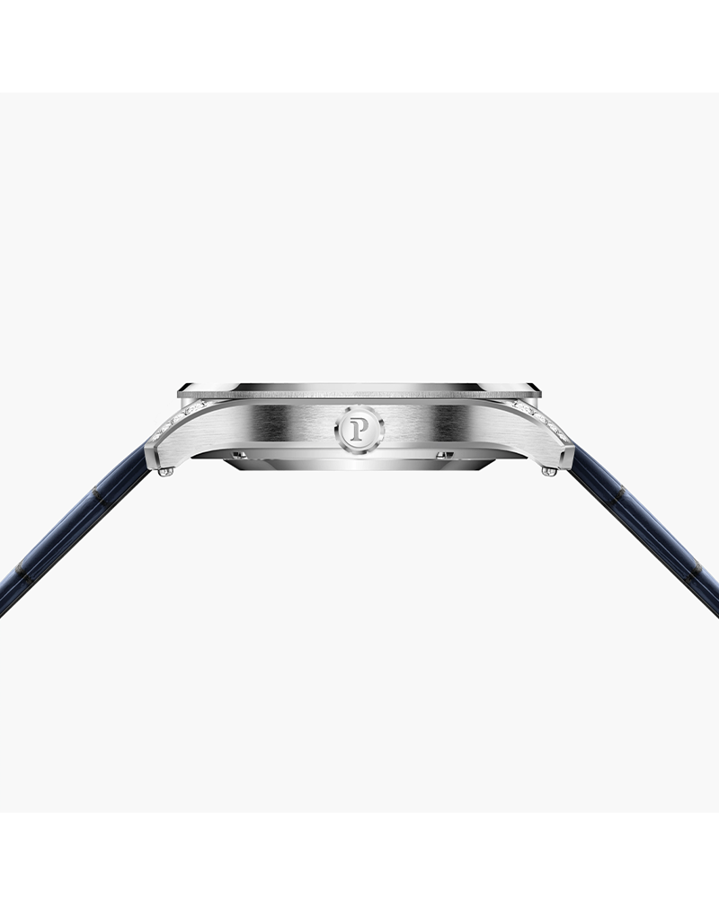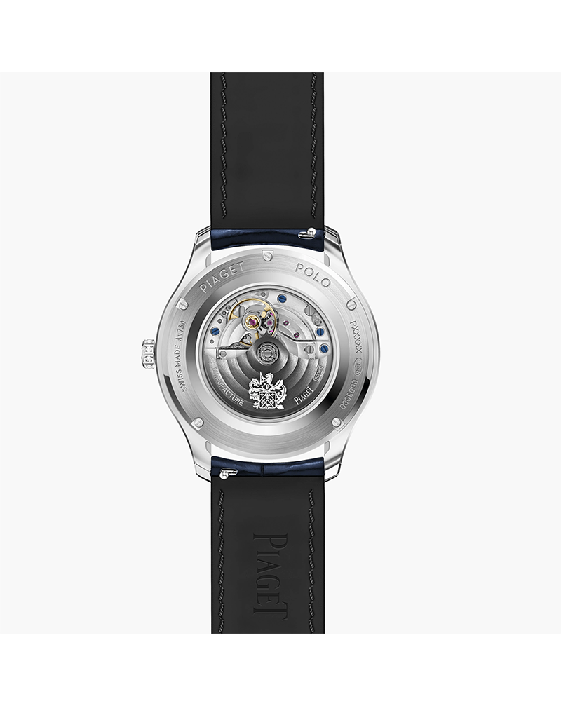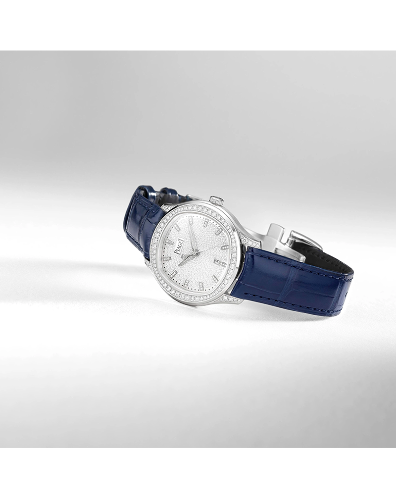 Piaget Polo Date watch, 36 mm. Case in 18K white gold set with 80 brilliant-cut diamonds (approx. 1.22 ct). Diamond-paved dial with hour markers in 18k white gold set with 352 brilliant-cut diamonds (approx. 1.21 ct). Crown set with 9 brilliant-cut diamonds (approx. 0.02 ct). Interchangeable strap. Manufacture 500P1 self-winding mechanical movement. Discover the diamond-set elegance of this 36 mm Piaget Polo in white gold for women. A high jewellery watch with a rich history, this diamond watch for women is inspired by the original Piaget Polo sport watch. Today, this watch lives on with a high jewellery update. Bringing sublime feminine touches to the iconic cushion-shaped dial, the bezel is set with brilliant-cut diamonds and the dial is fully paved. This is a Swiss self-winding watch that shows the exquisite gem-setting expertise of the Maison.