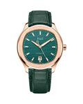 Piaget Polo Date watch, 42 mm. Case in 18K rose gold. Green-coloured guilloché décor dial with luminescent hour-markers. Sapphire crystal case back. 1110P Manufacture automatic mechanical movement.