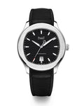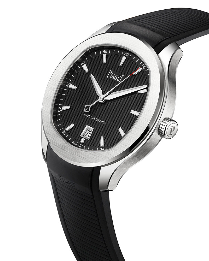 Piaget Polo Date watch, 42 mm. Steel case. Sapphire crystal case back. Interchangeable rubber bracelet. 1110P Manufacture automatic mechanical movement.