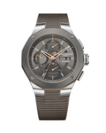 Equipped with a Valjoux automatic movement, this RIVIERA features a sun satin-finished slate-grey dial and a gray rubber strap with canvas decoration. Featuring a sandblasted titanium bezel enlighted by a PVD gold ring, this timepiece is perfectly in keeping with the Maison's chronograph tradition. With its 43 mm-diameter steel case and dodecagonal bezel in bead-blasted titanium, secured by four bead-blasted steel screws, this timepiece with a strong character sets the tone from the very first glance: passion for action. A chronograph with a powerful design that respects tradition and rewrites the future. The original design is there, as is the desire to adapt to the times. The latest addition to the RIVIERA collection, this 100-meter water-resistant chronograph is powered by a high-quality Swiss Made self-winding mechanical movement and displays the day and date in two horizontal windows at 3 o'clock. Emblematic of sport-chic, this watch offers the evocative power of the original 70s models by revisiting their DNA. It has the form, the spirit and the function.