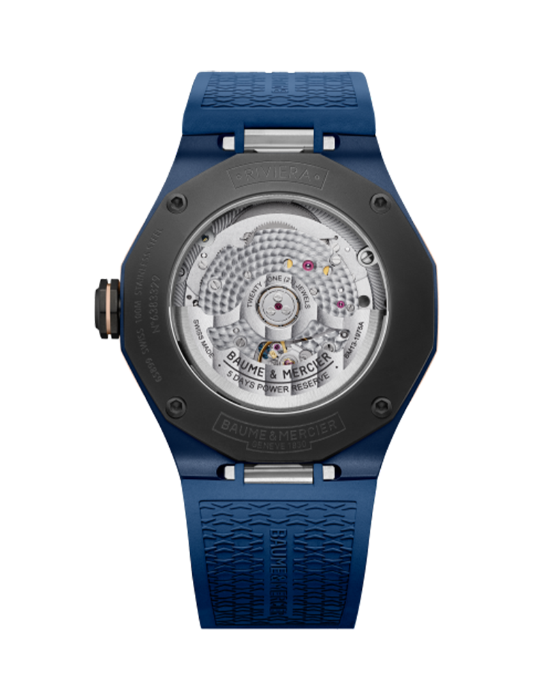 The RIVIERA Baumatic 10769 embodies the mineral facet of the RIVIERA by featuring a steel case paired with a sandblasted titanium bezel. This 42mm timepiece houses a manufacture Baumatic movement ensuring precision and durability, complemented by a sapphire blue dial and a blue interchangeable rubber strap with canvas decor.The RIVIERA 10769 sporty look built on a stone that imparts subtly nuanced hues even as the blue dial reflects the depth of the sea. This version of the RIVIERA features a dodecagonal case with a diameter of 42 mm. Its exquisite craftsmanship intensifies its luminosity, showcasing its graphic color contrasts and precise time indications. In this bicolor version, the RIVIERA subtly combines titanium with blue PVD, asserting a proud appearance. Powered by a manufacture Baumatic movement, the timepiece ensures precision, durability, and a five-day power reserve. The built-in blue rubber strap features a canvas pattern. The strap may be changed without the use of tools thanks to a robust, reliable mechanism.