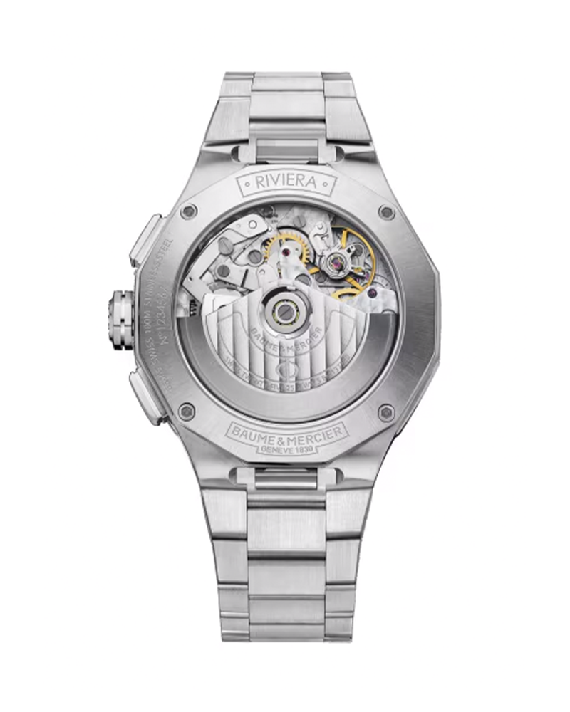 The Riviera chronograph 10825, inspired by the 43mm version, joins the collection in a slimmer 41mm format. Its dodecagonal case in polished and satin-finished stainless steel is protected by an anti-reflective sapphire crystal. The black dial with a wave pattern, featuring snailed counters and snailed minute track, highlights the Roman numerals, indexes, and rhodium-plated hands with white Superluminova. It is equipped with an automatic movement with a 48-hour power reserve and water resistance to 10 ATM. The interchangeable stainless-steel bracelet features a reliable system for tool-free changes.