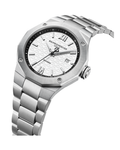 The Riviera 10829 is distinguished by a black and white contrast that is both bold and harmonious. Its white dial with a wave decor is highlighted by a black bevel. The riveted Roman numerlas, indexes, and faceted rhodium-plated hands are coated with white Superluminova. The black seconds hand with Phi logo on the counterweight accentuate this two-tone design. It is equipped with an automatic SW200 movement with a 38-hour power reserve and water resistance to 10 ATM. The interchangeable stainless-steel bracelet features a reliable system for tool-free changes.