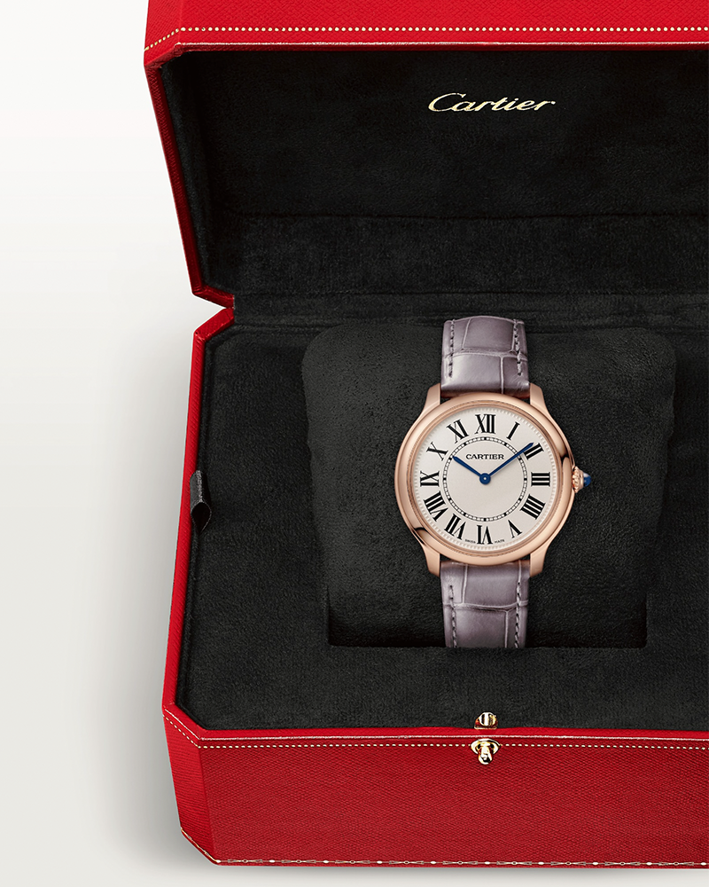 Ronde Louis Cartier watch, 36 mm, quartz movement. Case and beaded crown in rose gold 750/1000 set with a blue sapphire. Sandblasted beige dial. Blued-steel sword-shaped hands. Sapphire crystal. Strap in semi-matte purple leather strap, ardillon buckle in rose gold 750/1000. Thickness: 7.18 mm. Water-resistant to 3 bar (approx. 30 metres).