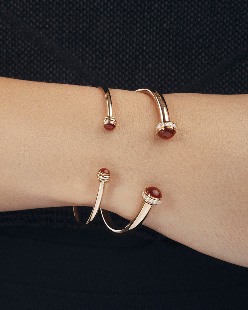 Possession open bangle bracelet in 18K rose gold decorated with 2 carnelian cabochons.
