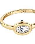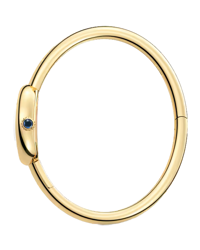 Baignoire de Cartier watch, mini model, size 15, quartz movement. 18K yellow gold (750/1000) case. 18K yellow gold (750/1000) beaded crown set with a sapphire cabochon. 18K yellow gold (750/1000) rigid bracelet. Silvered dial, blued-steel sword-shaped hands, sapphire crystal. Length: 24.6 mm, width: 18.7 mm, thickness: 7.2 mm. Water-resistant up to 3 bar (approx. 30 meters).