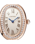 Baignoire de Cartier watch, small model, size 16, quartz movement. 18K rose gold (750/1000) case set with 42 brilliant-cut diamonds totaling 0.48 carats. 18K rose gold (750/1000) beaded crown set with a diamond totaling 0.08 carats. Silvered dial, blued-steel sword-shaped hands, sapphire crystal. Length: 31.4 mm, width: 23.1 mm, thickness: 6.9 mm. Water-resistant up to 3 bar (approx. 30 meters/100 feet).